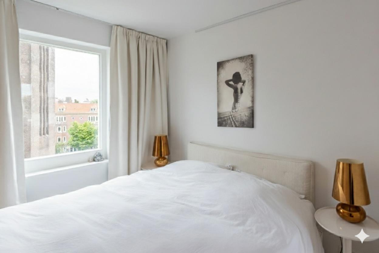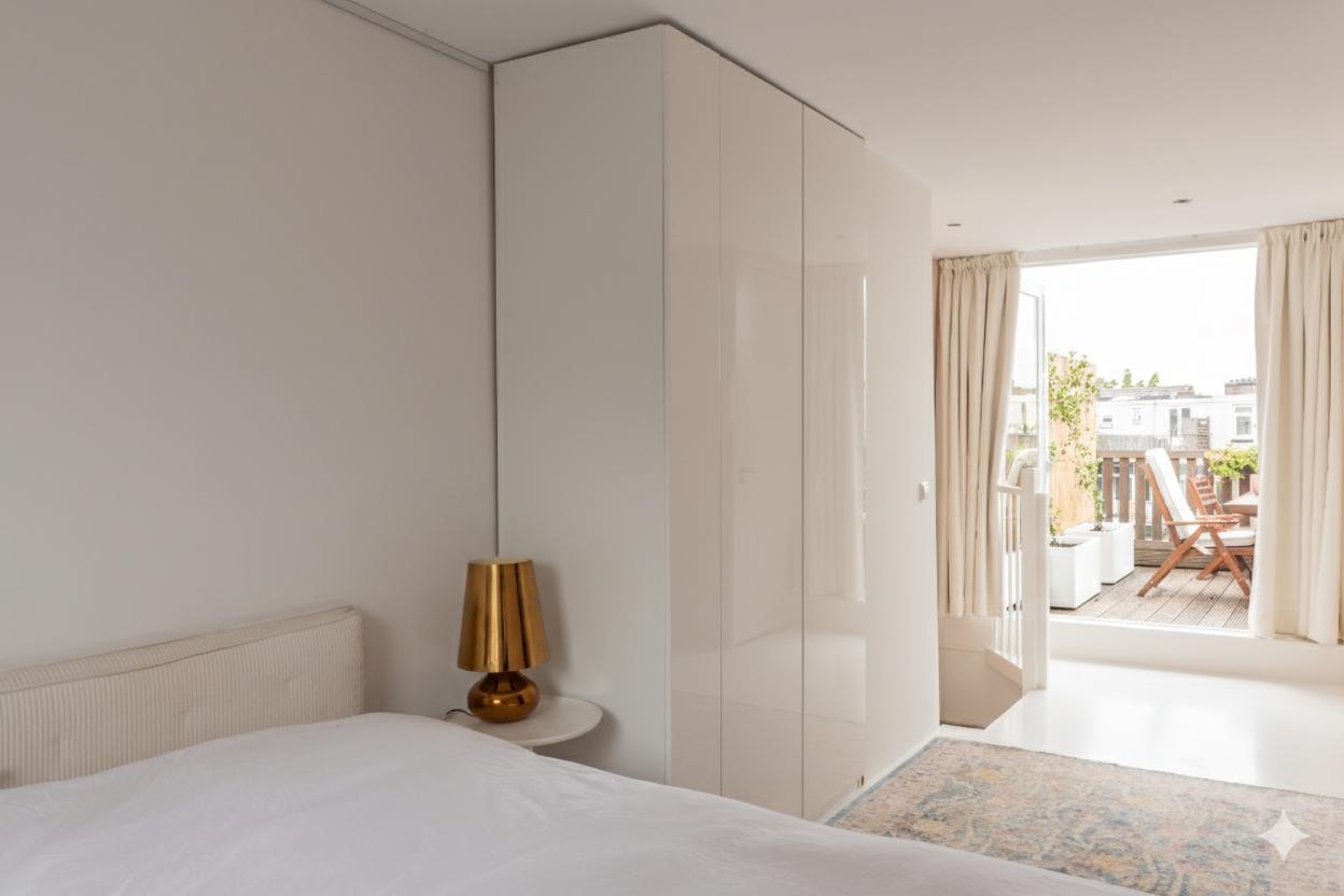 Luxurious modern 2 floor apartment sleeping up to a maximum of 4 guests and located in the renowned Pijp area of Amsterdam. The apartment covers a spacious 90m2 with the living room, open kitchen, smaller bedroom and toilet on the third floor and one large bedroom, bathroom equipped with a shower and a bath and a 25 m2 roof terrace on the 4th floor.